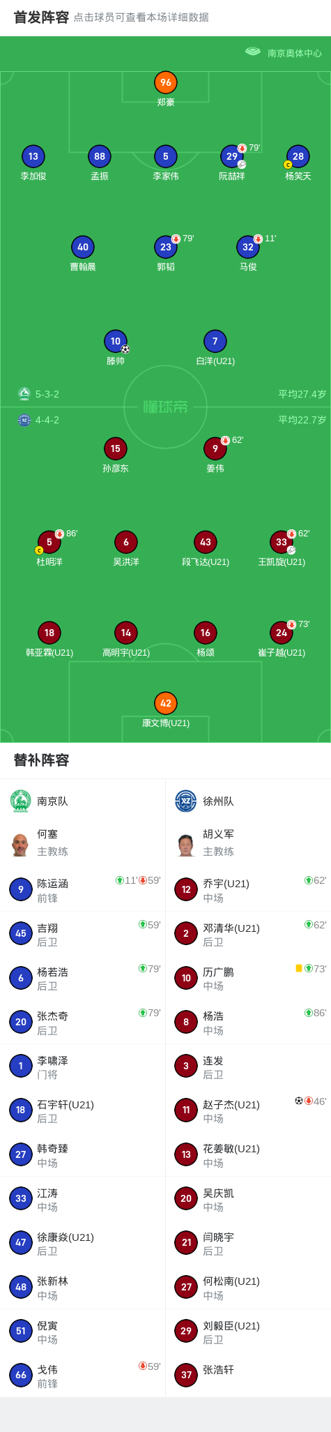 江苏省城市足球联赛第11轮,南京队主场迎战徐州队。比赛中,徐州队球员赵子杰接队友王凯旋传球成功破门。随后,南京队由阮喆祥助攻滕帅扳平比分。最终双方以1-1握手言和。